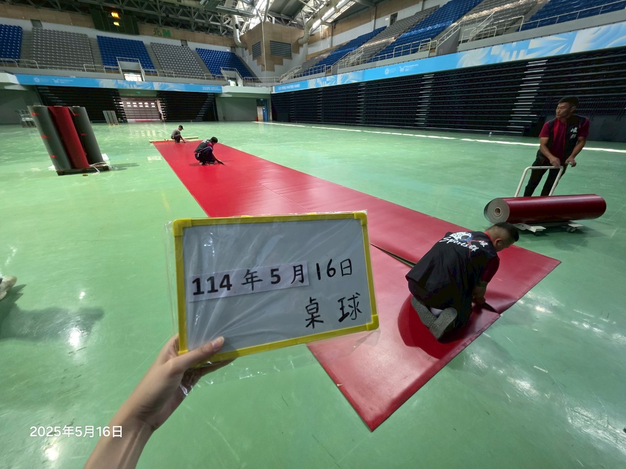 桌球比賽現場(賽前佈置-帕拉項目桌球地墊鋪設完成)